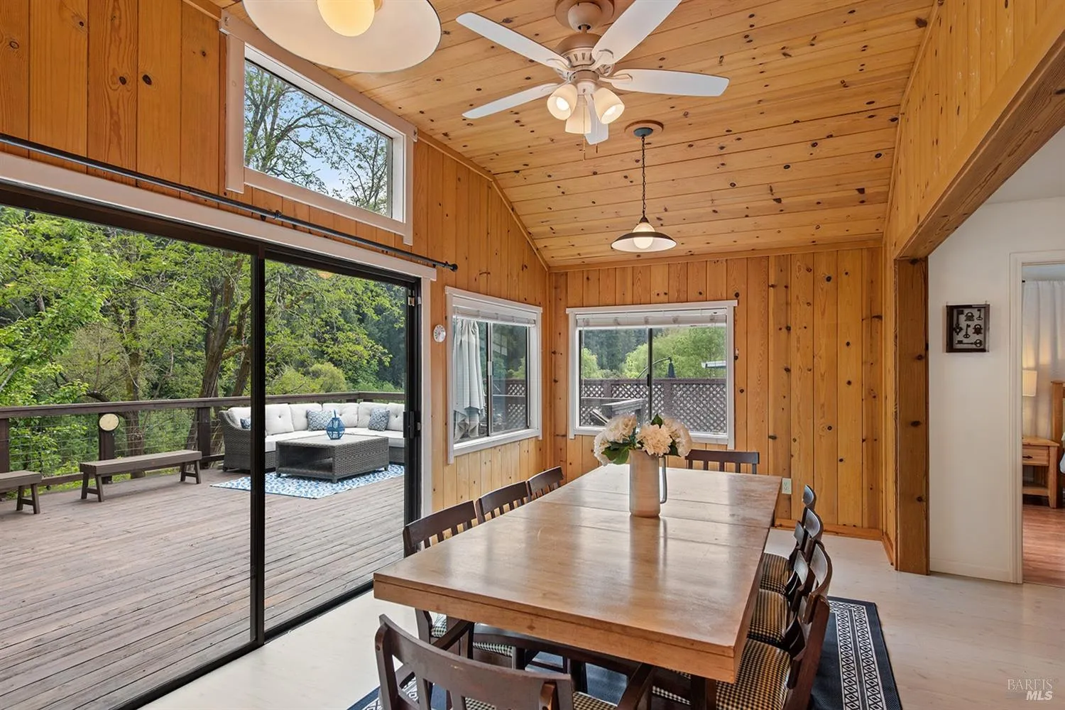 A rare offering on the Russian River, this quarter-acre riverfront property has a private dock for a morning swim or to launch your kayak. The main living level features a large open floor plan, living area, kitchen with a breakfast bar as well as a large dining area that leads out to an expansive upper deck, perfect for outdoor dining, grilling and enjoying summer evenings around the fire pit overlooking the river. Set back from the road with a flat, usable backyard, the home also features a large lower deck. The layout is ideal for flexible living, with the lower level offering its own private entrance, a kitchen area, and separation from the main floor making it ideal for entertaining guests or generating supplemental income.