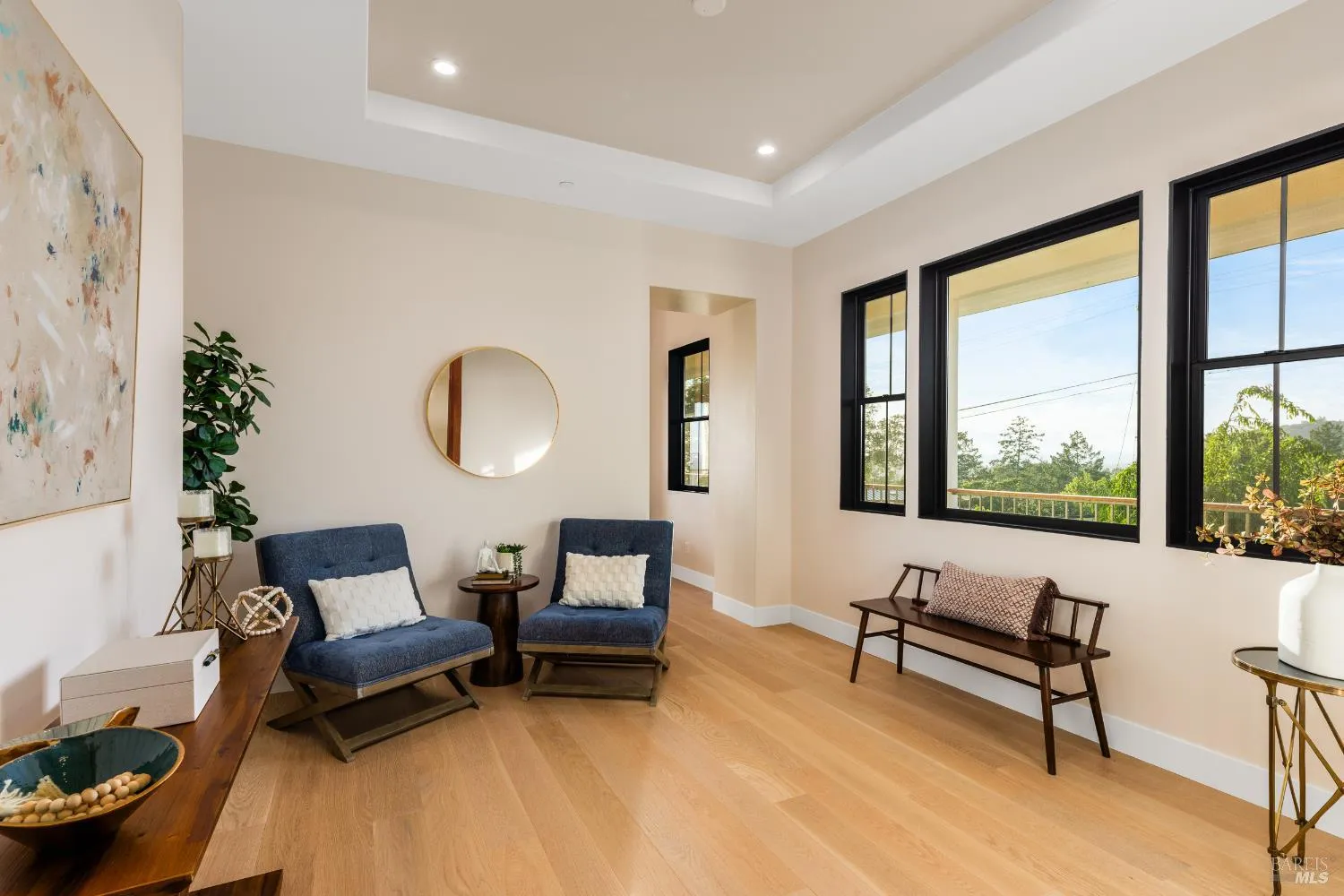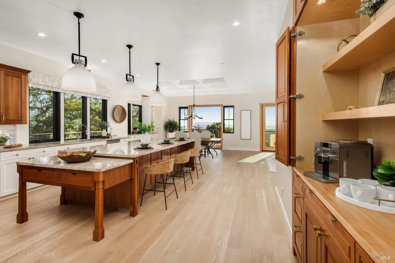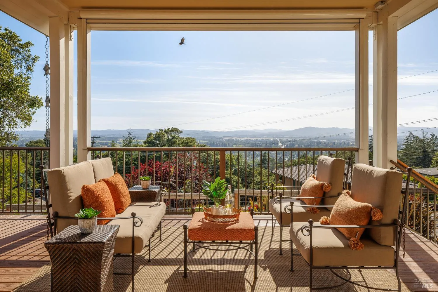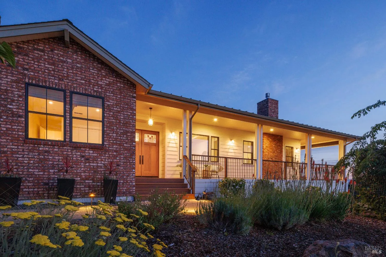 Welcome to exquisite 1335 Wikiup Drive. This captivating single-story custom residence, designed by Farrell Faber in Santa Rosa’s beloved Wine Country neighborhood offers breathtaking sunset views. Home features 4 spacious bedrooms, 2.5 luxurious bathrooms, dedicated office space all on a large, beautifully landscaped .59-acre lot. The gourmet kitchen is an entertainer’s dream, featuring top-tier BlueStar appliances, a generous walk-in pantry, charming coffee bar & expansive island. The great room is adorned with architecturally appealing coffered ceilings & features a fireplace with walnut surround. The designer appeal showcases solid cherry double entry doors, while extensive white oak flooring adds warmth & elegance. The inviting wrap-around porch boasts breathtaking vistas of cityscape & distance mountains where the fog often rolls in. The primary suite offers views, luxury bath & direct patio access. There’s great outdoor entertaining with Trex decking & spacious patio. Professionally landscaped low maintenance grounds with fruit trees and colorful foliage. Enjoy minimal energy bills with paid-for solar & robust battery backup, oversized garage & convenience of being close to shopping, the Wikiup Swim & Tennis Club, Sonoma County Airport, wineries & fine dining.