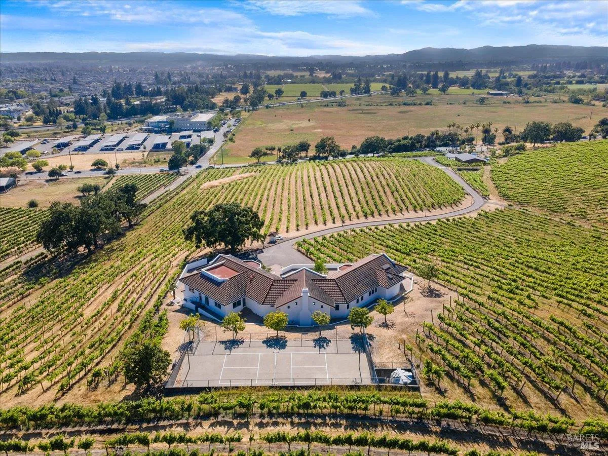 Perched atop a gently rising knoll with dramatic views of Santa Rosa’s renowned Wine Country is an extraordinary 26.21-acre vineyard estate offering an unrivaled blend of luxury living & boutique wine production. A fusion of lifestyle & legacy, the property includes a custom-built residence, tasting room & event venue, seasonal pond, building pad, billboard & thriving vineyard. Built in 1998, the sprawling 4,094 SF custom home boasts 4 bedrooms, 3.5 bathrooms & top of the world views. Expansive windows frame panoramic west-facing views beneath soaring vaulted ceilings. A chef’s kitchen & large dining & living room with bar area for hosting and your very own pickleball/basketball court. The 2,000 SF tasting room offers granite counters, restroom, an insulated finished storage area & a pergola-covered patio with seating for up to 40 guests. The estate holds a rare use permit allowing multiple events per year. The Russian River Valley AVA vineyard includes 9 acres of Chardonnay & 7.5 acres of Pinot Noir with separate irrigation well with 10,000 gallon storage tank. A separate building pad offers potential for expansion or a guest house. With high visibility along Old Redwood Highway, the billboard rental income provides for added revenue.