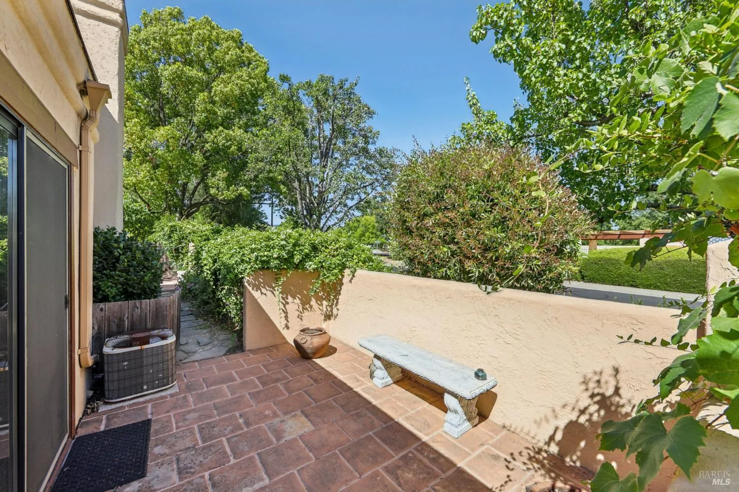 Look at this lovely single level condo with a Mediterranean flair and a great new price! Well-placed skylights throughout provide so much natural light. The bright open kitchen has plenty of counter and storage space, oversized Subzero refrigerator/freezer, gas cooktop, garden window, side patio access and more. The living room with high ceilings has a charming gas log fireplace and plenty of room to relax and spread out. The generous Primary ensuite has a large step-in shower, its own Cedar lined walk-in closet, plus high ceilings and comfortable outdoor access. The second bedroom could be very adaptable as both an office or guest bedroom with existing Murphy bed. Located across from the pool/spa area, backed right up to a park, plus only steps from the Fryer Creek Trail, this private end unit with large back yard plus side patio is not to be missed.