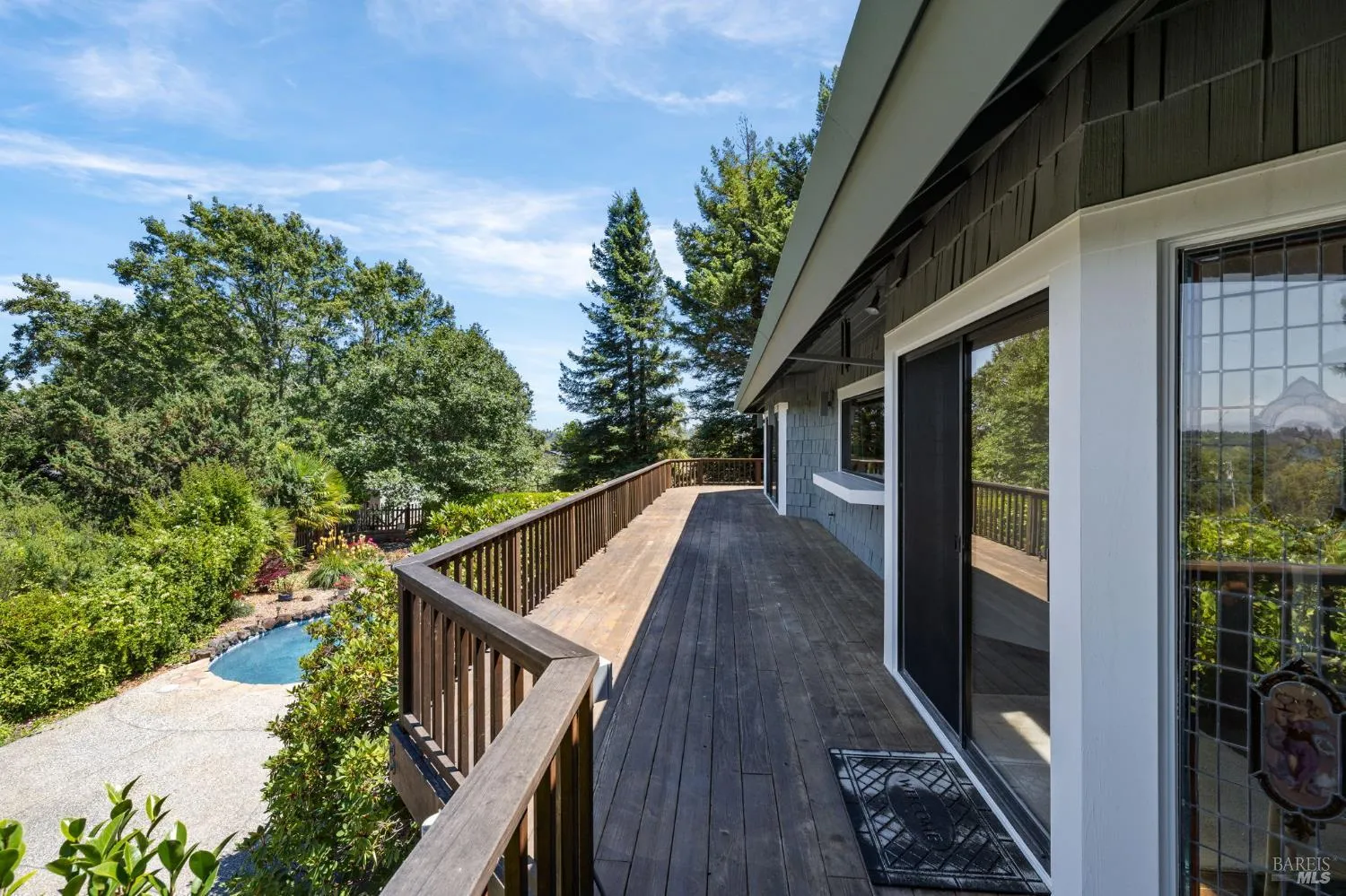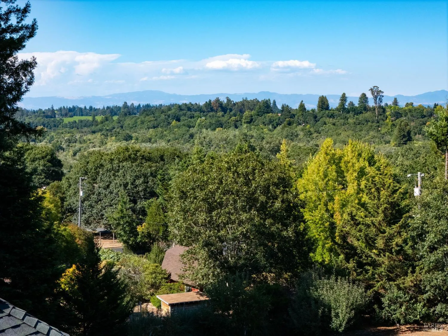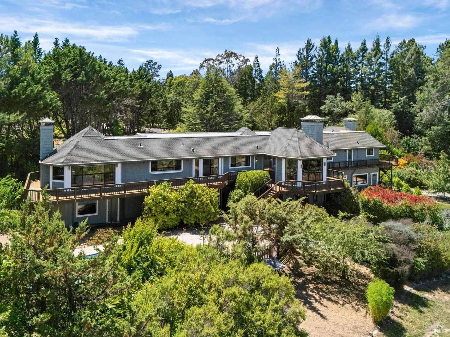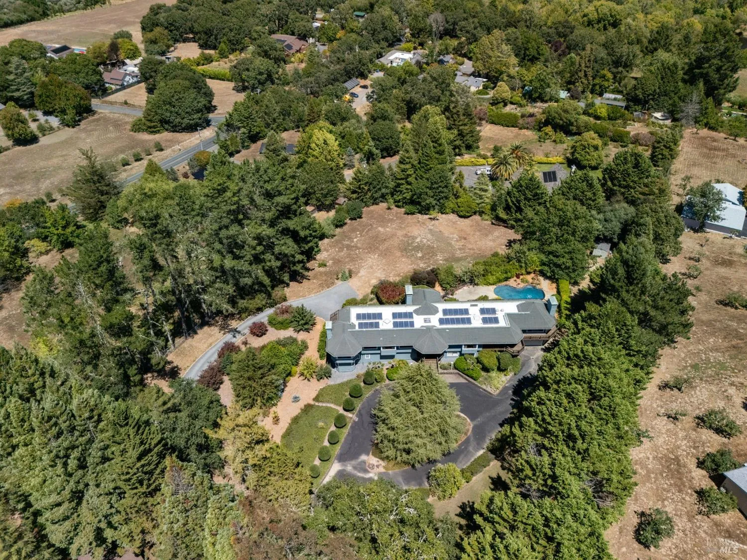 Tucked behind a gated entry in Sebastopol’s wine country, this 5600 sq ft estate is set on 2 private, fully fenced acres. Inside, warm wood details & soaring ceilings enhance light-filled living spaces. The single-level layout centers around an open living room with walls of glass, a fireplace, & sweeping views to the Geysers & Mount St Helena. The kitchen features gorgeous granite counters, a large center island, & an easy flow into the living & dining areas, ideal for entertaining. You will also find 3 bedrooms, 2.5 baths, a formal dining room, a spacious office, & a library with sliding ladder. The primary suite has its own fireplace & en suite. Multiple sliding doors open to a full wrap-around deck that continues to the front of the home. Below, a beautiful saltwater pool, spa, & patio are surrounded by lush gardens & privacy. Downstairs, a private guest suite includes a bedroom, full bath, kitchenette, laundry, carport, & private entrance. On the other wing of the home, the pool house provides a second guest suite with a bedroom, 1.5 baths, a kitchenette, & cedar-lined sauna. An inviting wine cellar with arched stone ceilings adds a surprising finishing touch. Come see this unique wine country retreat, just minutes from downtown Sebastopol & Graton.