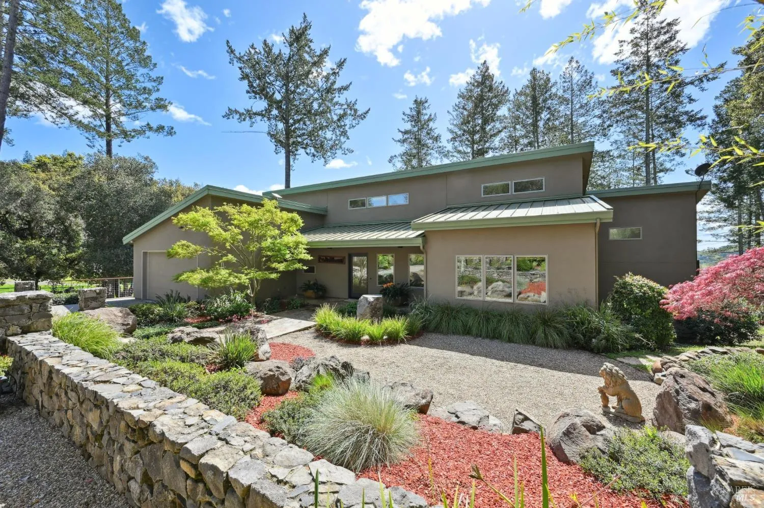 On a serene 1.8-acre parcel in the gorgeous hills above Santa Rosa rests this modern home with detached shop only 10 minutes from town! Quality of construction is felt throughout! With an abundance of natural light, this open & spacious home features 2 primary bedroom suites and an office with view of the wonderful garden. This home is solid and fire-resilient, featuring a metal roof, steel trusses, soaring ceilings and clerestories from which the light just pours in. The gourmet chef’s kitchen is a culinary haven, featuring butcher block & stainless countertops and a 5-burner Wolf stove. The living room opens up to the spacious deck with gorgeous views of the surrounding hills and trees. Rich bamboo flooring and radiant floor heating throughout add a touch of warmth and elegance. Also featured are a circulating hot water, central vacuum system, and security system. This sunny and private lot has a huge beautifully paved driveway behind an automatic gate. Wonderfully landscaped garden with spacious seating area, outdoor firepit, and soothing water feature. A 748 sqft detached shop with loft are ready for any of your hobbies. Nestled in the heart of Wine Country, this home offers the serenity of the countryside while being just 10 minutes from shopping, dining, and conveniences.