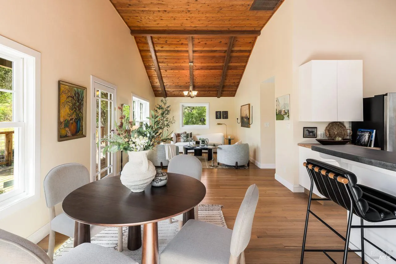 Charming West Dry Creek Retreat set amidst the rolling vineyards of Healdsburg’s renowned Dry Creek Valley, this idyllic country residence offers an ideal blend of privacy, charm, and proximity to downtown. Situated on approximately 2.6 acres atop a private knoll, the property boasts panoramic southern vistas and end-of-road seclusion beneath a canopy of native trees. The well maintained three-bedroom home is filled with natural light and timeless character, featuring solid oak flooring, a wraparound redwood deck, and a newer roof. Recently refreshed with both interior and exterior paint, the home is move-in ready, while offering the warmth and serenity of country living. A detached 28′ x 30′ garage/workshop presents a wealth of possibilities ideal for creative pursuits, storage, or future conversion. The fenced grounds invite potential for gardens, a pool, guest house, or pet-friendly spaces. Just 4.5 miles from Healdsburg’s celebrated plaza, yet worlds away in tranquility, this is a rare opportunity to own a piece of wine country’s most coveted landscape.