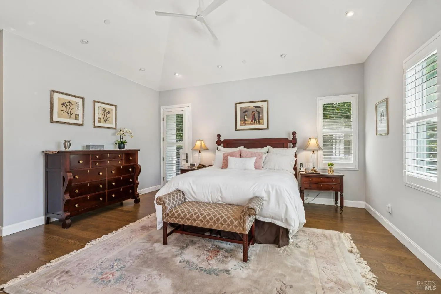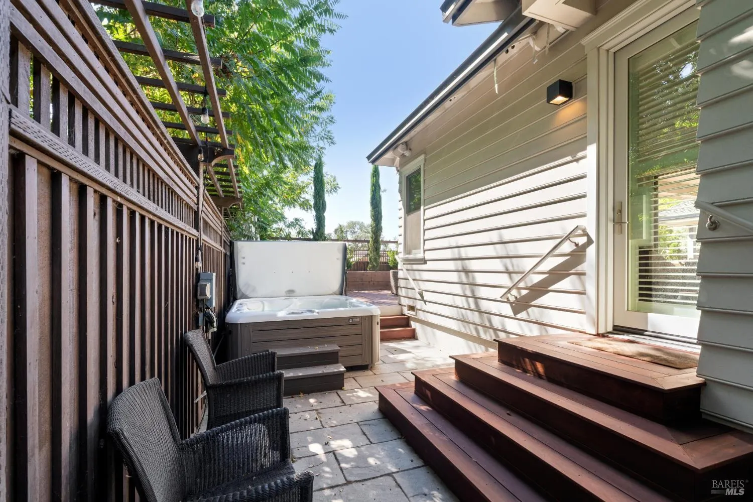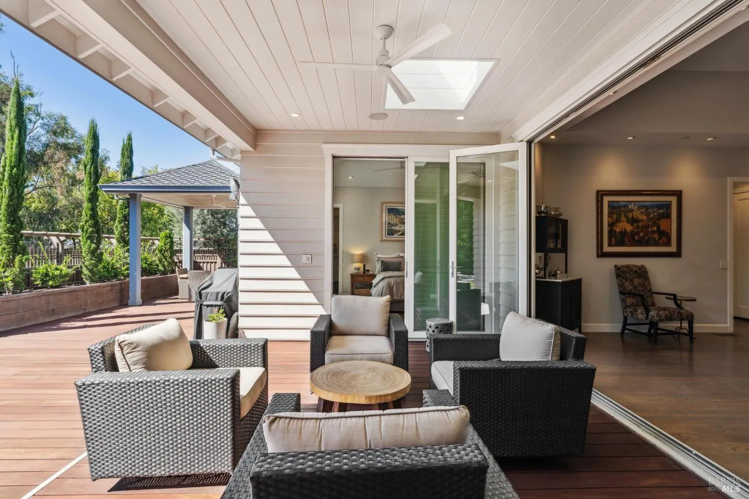 Located on Sonoma’s east side, this exceptional property offers unparalleled access to wine country’s premier shops, tasting rooms, wineries, and acclaimed restaurants. Nestled down a private lane, the 2,578 sq ft home combines luxurious interior features with stunning outdoor living. Inside, the residence boasts three spacious en-suite bedrooms, hardwood floors, and designer finishes throughout. The chef’s kitchen is equipped with quartz countertops, stainless steel appliances, wine refrigeration, and butler pantry perfect for entertaining. Cathedral ceilings and Nano doors open to a wrap-around deck with a serene water feature, blending indoor comfort with outdoor elegance. The exterior dining area includes remote-controlled auto screens, providing shade for outdoor gatherings. The primary bedroom with en-suite bath offers a walk-in closet, jetted tub, and steam shower, with radiant heat in the bathroom floors. Natural light floods the space through plantation shutters and sliding doors leading to the private hot tub. The front porch is beautifully landscaped, with seasonal blooms and professional design creating a welcoming curb appeal. The abundance of space and style effortlessly blend making this home a true entertainer’s paradise.