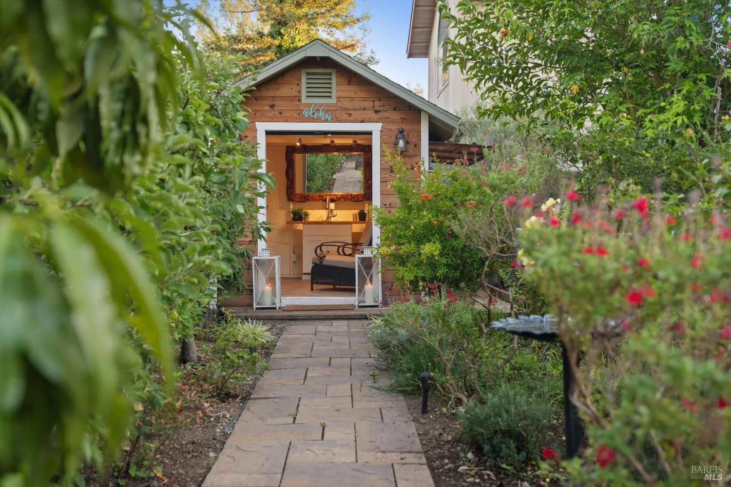 Welcome to this immaculate, single level home in a wonderful established neighborhood. Just a short stroll along a peaceful walking path to schools, neighborhood parks & shopping. In close proximity to the beloved Foothill Regional Park with 211 acres of wilderness to explore. This spacious residence features vaulted ceilings, central A/C, and a bright, open floor plan, anchored by a cozy gas fireplace. An open concept kitchen consists of beautiful IceStone recycled glass countertops & ample storage. Seamless indoor-outdoor living awaits with sliders from both the family room and primary suite opening to a generous sundrenched deck, perfect for morning coffee or al-fresco dinners. The backyard is a private sanctuary framed by mature fruit trees and vibrant gardens. Not to be missed is the stylish detached structure complete with a flat screen TV, a roll up door, and a serving bar expanding the possibilities for welcoming guests, a home office or creative pursuits. A finished, tile floor garage adds extra utility and a polished touch. Combining privacy and comfort, this property delivers an exceptional lifestyle in a lovely community.