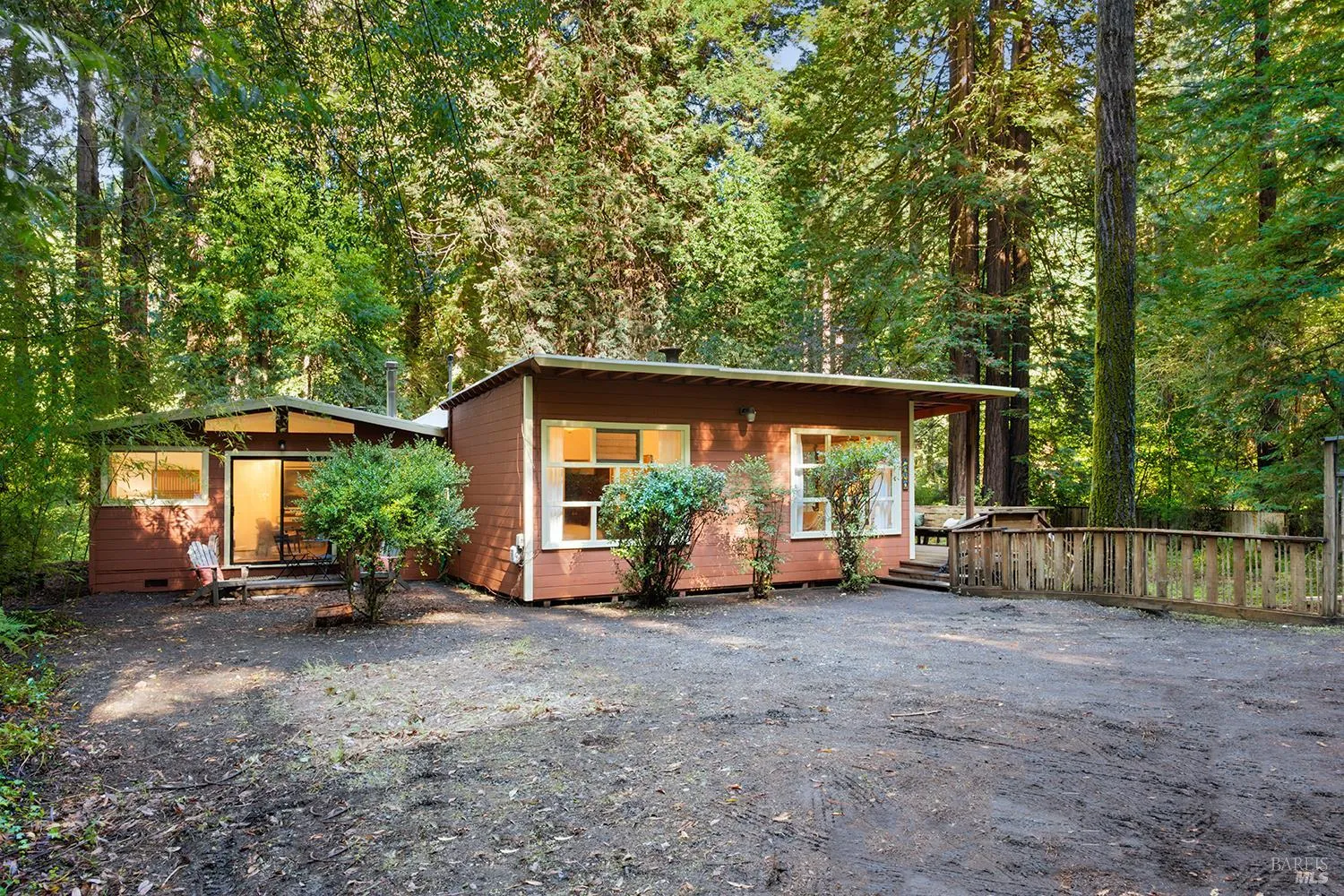 Surrounded by filtered sunlight and the quiet grace of towering trees, lies a truly rare offering: a lovingly maintained residence for the first time on the market in more than 40 years. Set on nearly half an acre, this 1,558sqft home offers 2 bedrooms and 1 bath. Step into storybook charm via a broad, sun-soaked wrap-around deck with built-in bench seating, a gracious welcome, perfect for both quiet mornings and festive gatherings. Inside, you’ll find exposed craft-beams and vaulted wood ceilings, conjuring a refined yet rustic mid-century cabin-style aesthetic. Bright and open, the kitchen is gracefully positioned between the dining and family areas, where natural light pours in creating a perfect flow for effortless entertaining. The primary suite is a serene retreat: imagine arched ceilings, wood beams, generous windows overlooking the forest, and exterior access to a spacious deck. Outside, a self-contained additional space with a private entrance offers the perfect spot for guests or a creative studio. The level lot offers generous parking, including space for an RV or boat, and just a few doors down you’ll find convenient access to Austin Creek for nature lovers and outdoor adventurers alike. A rare presentation: fully and truly one of a kind. Don’t miss this opportunity.