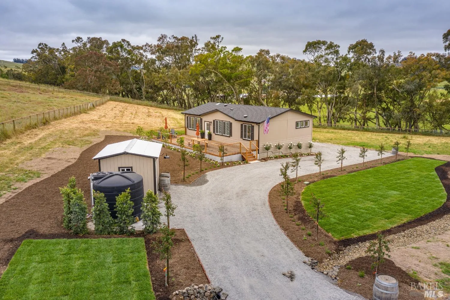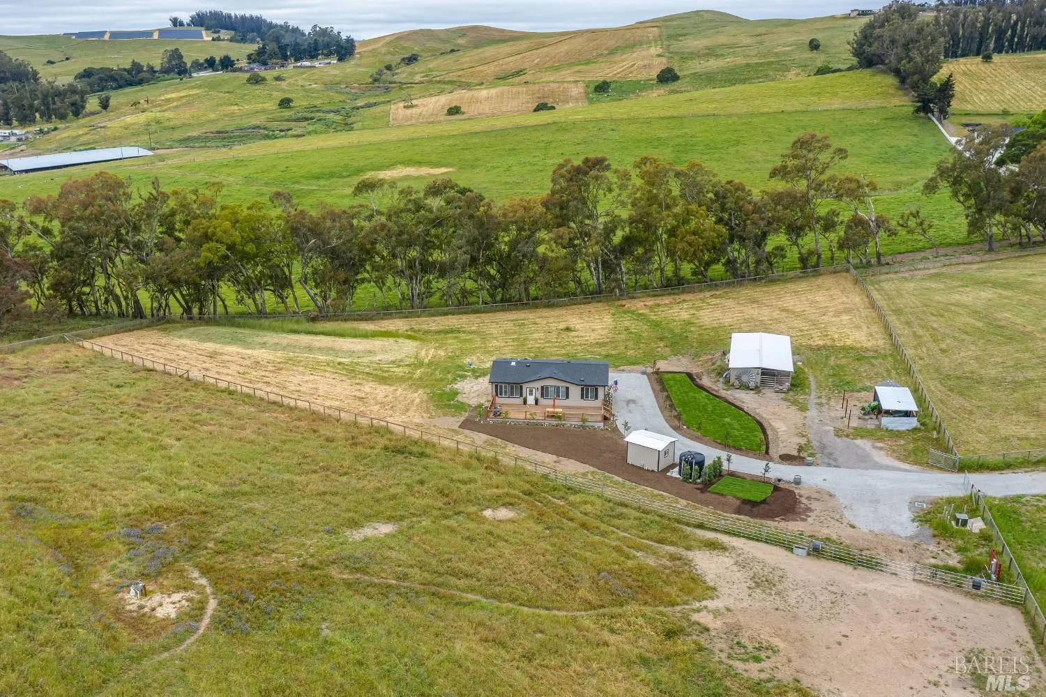Serene West Petaluma country property located on 5 acres with views, at the end of a newer paved road (May 2020). Gorgeous 1,188 square foot, 3-bedroom, 2 bath single-story manufactured home completed in 2023. Plenty of space/septic and well capacity to build another home. Recently built (August 2021) two-stall horse barn plus tack room with full-length 12′ overhang (generous 12’x16′ stalls), new well completed in August 2021, drilled to 380 feet deep and yielding 8-10 gallons per minute. 5-bedroom septic system installed in 2022. Entire parcel with wood fencing around perimeter and cross-fenced, pasture, automatic entry gate, utility carport for farm equipment and plenty of space for RV parking. Enjoy outside entertaining on the large deck! Beautiful landscaping with lawn areas. In the center of the Petaluma GAP AVA, approved in 2017. Excellent region for growing Pinot Noir. Award-winning, highly rated and desirable Liberty School District. Surrounded by estate homes on acreage. A close drive to US 101 South and North. Close to downtown, shopping, wineries, and the beach, but away from the crowds. Beautiful sunsets in a peaceful country setting!