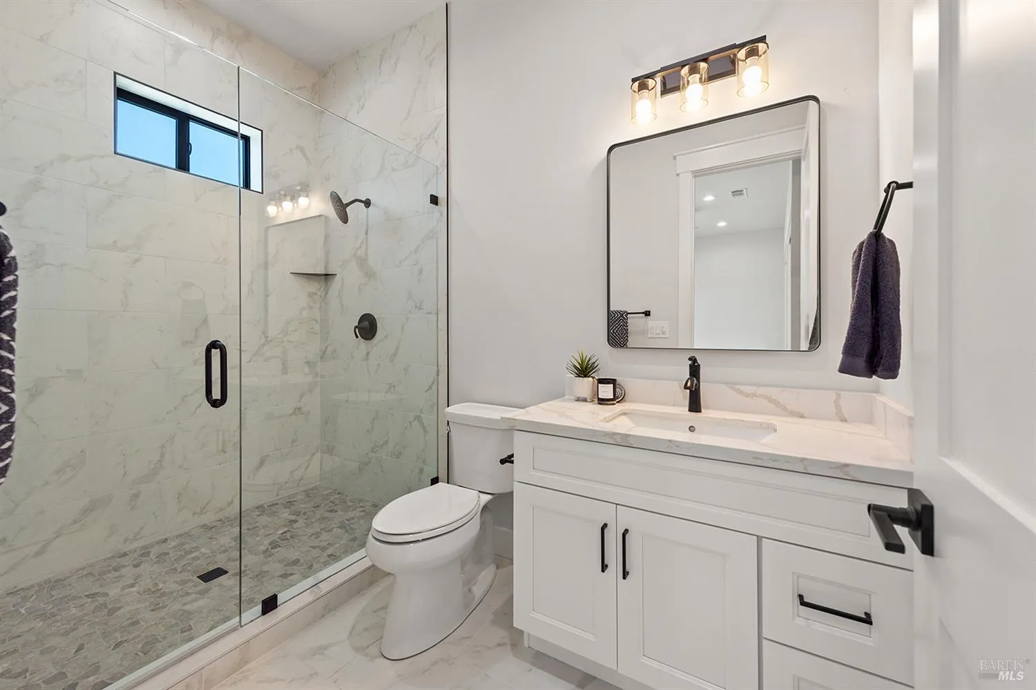 Newly completed luxury home in Fountaingrove on a level quarter-acre lot. This 4BD/4BA residence offers over 3,700 sq ft of refined living space with 10-ft ceilings, engineered hardwood floors, and an open layout for modern living. The chef’s kitchen impresses with a $45K Thermador appliance suite, quartz countertops, and custom cabinetry. The main-level great room flows to a covered patio for seamless indoor-outdoor entertaining. Upstairs, a spacious family lounge and large balcony capture long-range views. Designed for efficiency and comfort, the home includes dual HVAC systems, owned solar with 5 kW battery, dual attic insulation, and a gas tankless water heater. The finished three-car garage with epoxy flooring completes this exceptional new build. Set on a private cul-de-sac, the nearly 12,000 sf flat lot offers ample space for a dream yard for a pool, pickleball, or garden. A rare opportunity in one of Santa Rosa’s most desirable enclaves.