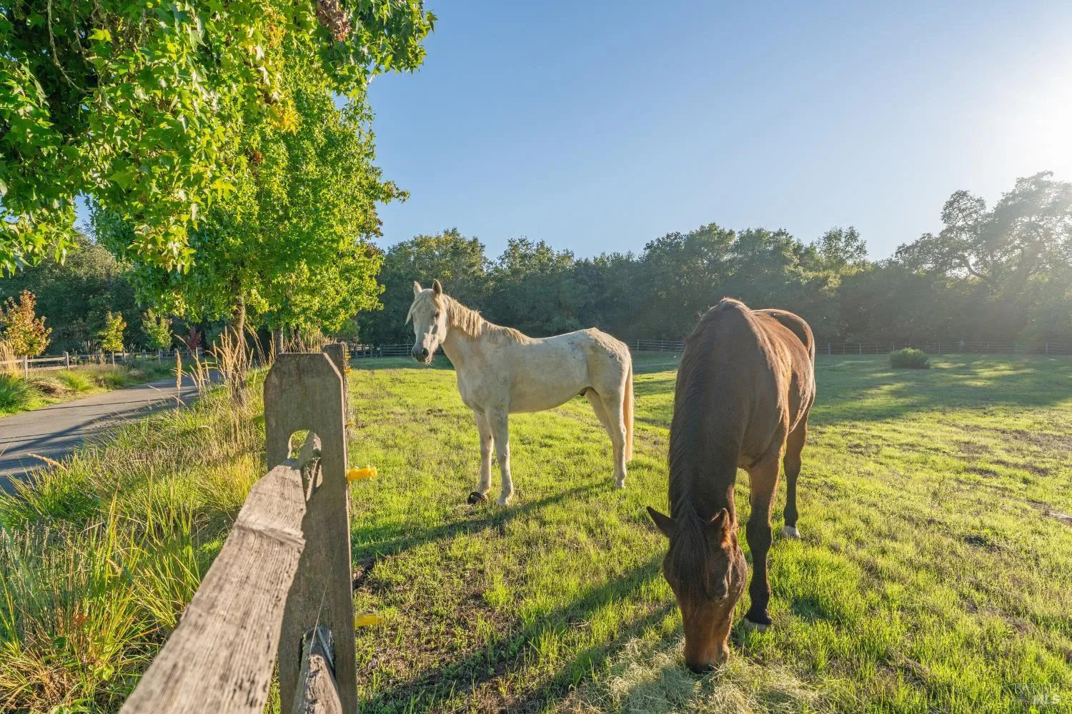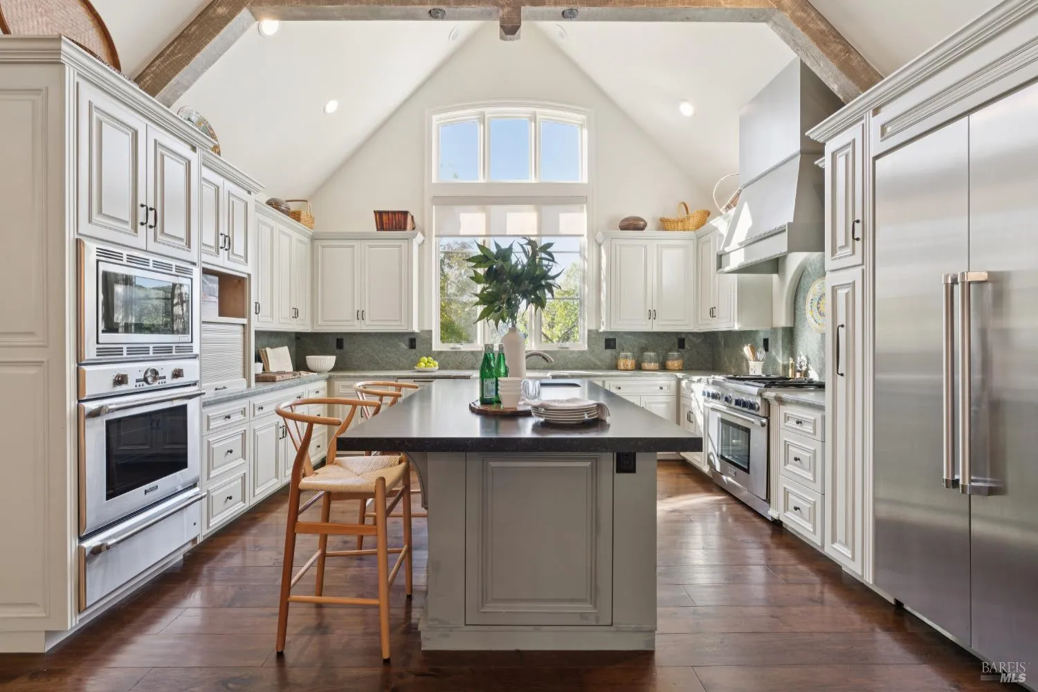 Behind gates and oriented to lake and vineyard vistas, this elegant estate pairs resort-style amenities with space to cultivate your own Wine Country lifestyle – think gardens, orchard, and room for animals – minutes from acclaimed wineries, dining, and luxury amenities. Inside, a chef’s kitchen with large island and dual pantries opens to a vaulted dining room with fireplace. The living room’s open-beam ceilings and dramatic fireplace frame wall – length accordion doors that blend indoors and out. Down a spiral stair, a wine cellar adds true Wine Country character. On the main floor, the primary suite lives like its own wing, with fireplace, walk-in closet room, steam shower, and soaking tub, plus a sunroom ideal as a gym or studio stepping out to the pool and hot tub. A main-floor office with full bath adds flexibility. Upstairs, two ensuite bedrooms take in hillside and vineyard views. Outdoors, enjoy a built-in BBQ kitchen, covered dining patio, bocce court, pool, hot tub, raised garden beds, and substantial orchard. Equestrian amenities include run-in shed, pasture, tack room with electricity and water, and access to nearby riding trails. Roughly an hour from the Golden Gate your private Wine Country retreat with every comfort close at hand.