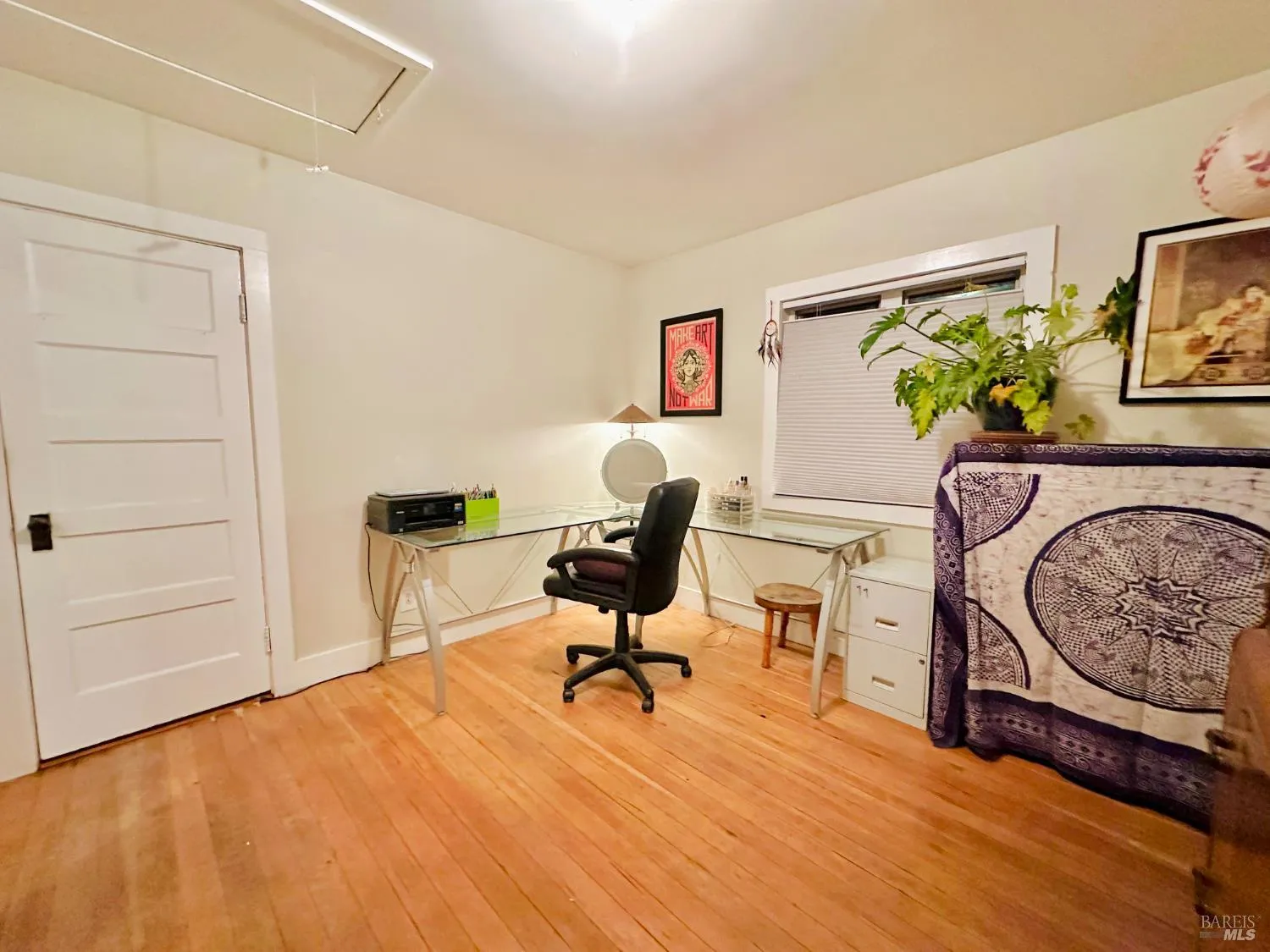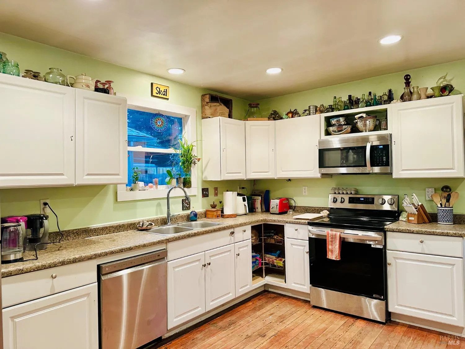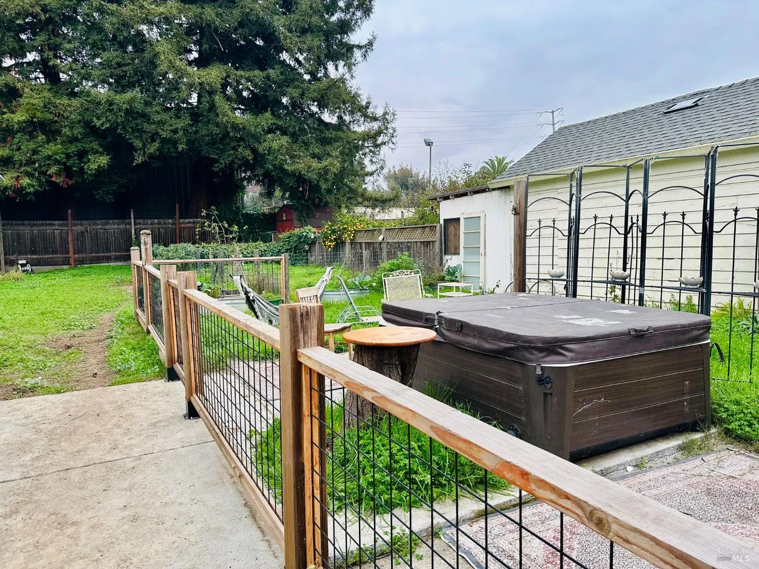 Cozy 2 bedroom 1 jack and jill bath, with vaulted ceilings in living room, extra room with separate entrance, spacious attic, basement storage space, detached laundry room/shop with front load washer and dryer, shed for storage (attached to laundry room), new appliances: microwave, stove, and dishwasher, newly painted cabinets, kitchen wood floors will be refinished soon, separate fenced off garden areas (backyard is in 3 sections), fresh water salt system hot tub can stay (negotiable), brand new highly efficient electric water heater, wood burning stove fireplace and radiant floor heat, roof is only 2 or 3 years old, all double pane energy efficient windows, property backs to warehouse with beautiful mature redwood trees, conveniently located near both 101 and 12 adjacent to west end/walking distance to downtown. The City will begin construction on sidewalks and streets with drainage in summer of 2026. SunRun solar, 2 large batteries, $215/month to lease, minimal gas bill. Owner has solely owned and lived here since 2016.