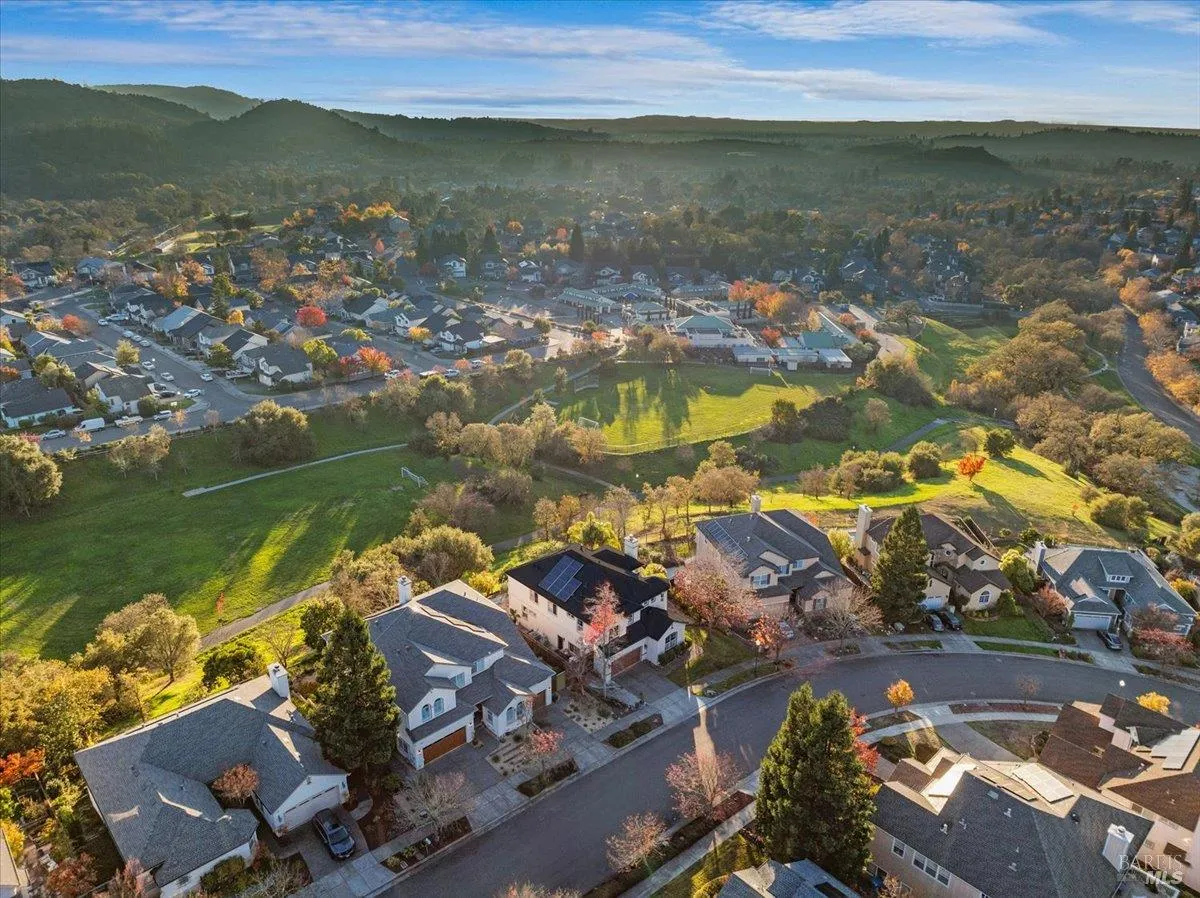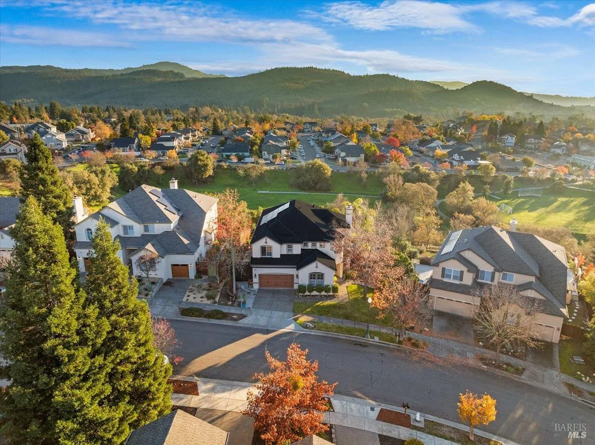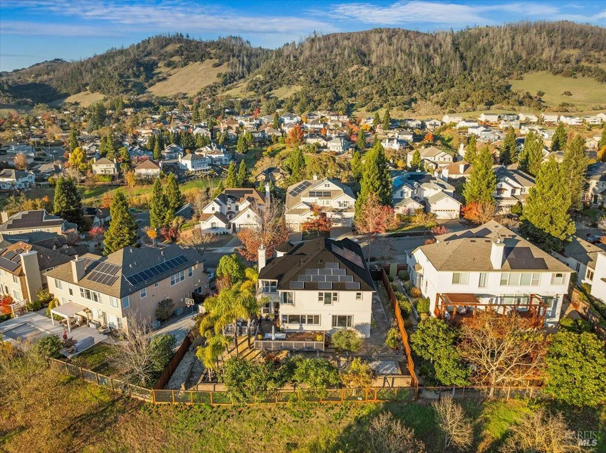 Perched on a premier street with sweeping outlooks, 5866 Sailing Hawk Ave is a rare blend of grand scale and curated, tactile luxury. Built by Christopherson, this home reflects quality construction and premium finishes throughout. Spanning over 3,700 square feet, the residence has been thoughtfully refined to deliver an elevated lifestyle that is both functional and striking. The experience begins upon entry, where a dramatic wrought-iron staircase anchors the foyer and sets a tone of quiet sophistication. At the heart of the home is a completely updated chef’s kitchen, designed for connection and everyday enjoyment, featuring custom cabinetry, striking stone surfaces, and distinctive solid, uncoated brass hardware. This living finish brings warmth, substance, and timeless character to a space meant to be lived in and loved. The main level flows seamlessly from formal living and dining rooms into a relaxed family space, centered around one of two inviting fireplaces. Expansive windows draw the eye outward to scenic vistas across the surrounding hills and parklands. Just beyond, the generous southwestern-facing rear deck is ideal for sunset entertaining and includes architectural plans for accordion doors, offering the opportunity to further enhance indoor-outdoor living. Upstairs, versatility continues with a spacious landing, reading nook, and open loft perfect for a home office, media lounge, or library. The accommodations are both rare and thoughtfully arranged: an expansive primary suite with walk-in closet and spa-inspired bath, along with two additional junior suites, each with its own attached bathroom. ideal for guests or multi-generational living. Recent refinements include a fresh designer paint palette and upgraded flooring throughout. A Tesla solar system supports exceptional energy efficiency and long-term sustainability. Located within a top-rated school district and moments from premier shopping, dining, and Trione-Annadel State Park, this is more than a home it is a legacy property ready for its next chapter.