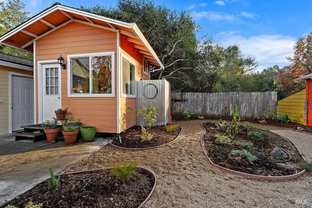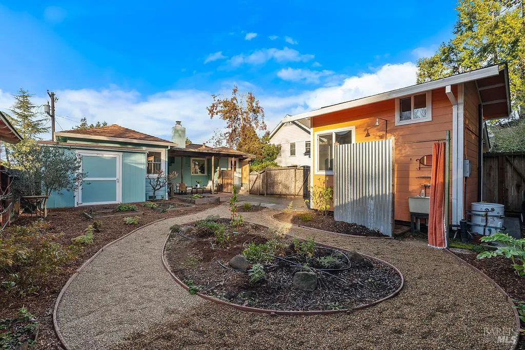 Set on one of Sebastopol’s sweetest cul-de-sacs, this irresistibly charming home makes the most of every square foot, with a wonderfully usable backyard and two extra buildings that add flexibility and more space. Inside, the living room feels light and inviting, with hardwood floors and a fireplace featuring a recently installed insert, perfect for cozy evenings. The kitchen is full of character, offering natural wood cabinetry, butcher block counters, and rich blue tile flooring. A sunny eat-in nook by the corner window creates an easy spot for morning coffee or lingering conversations. The primary bedroom is spacious, with hardwood floors continuing throughout the sleeping areas. The guest bedroom is bright and airy, and the bathroom includes an updated vanity. Laundry is conveniently located inside the home, just off the kitchen. Step outside to a true backyard sanctuary. A large covered patio extends the living space outdoors, ideal for dining, relaxing, and entertaining. The garden is thoughtfully planted with California natives for easy care, and the outdoor shower adds a fun touch for enjoying Sebastopol’s mild climate. Beyond the garden, two extra structures add incredible flexibility. The light-filled art studio features newer French doors and a new roof, making it an inspiring creative or work-from-home space. The charming tiny guest house includes a loft bed, space for a small fridge, a countertop for essentials, and an adorable half bath, perfect for guests, hobbies, or a quiet retreat. All of this is located in one of Sebastopol’s most loved neighborhoods. From 7859 Anthony Street, enjoy easy walks to downtown Sebastopol and The Barlow, Sunday mornings at the farmers market, and one of the area’s best parks just around the corner. A special property offering comfort, character, and a lifestyle that’s hard to beat.