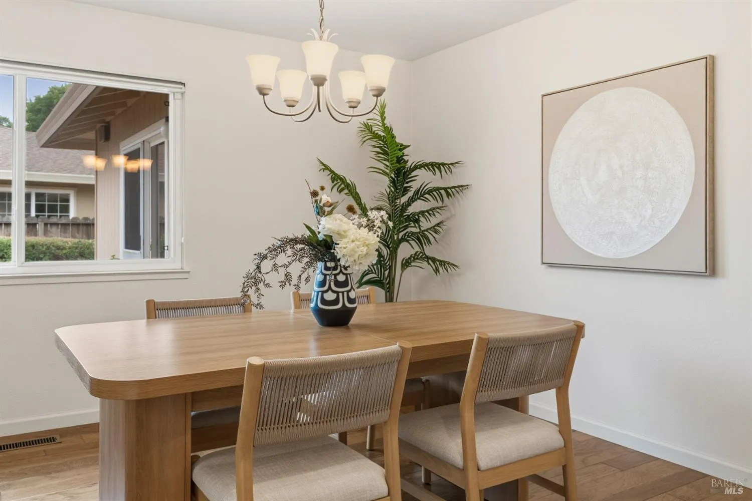 Located on a quiet corner lot in the highly sought-after Sherwood Forest neighborhood, this inviting single-level home offers comfort, character, and exceptional outdoor space. Engineered hardwood floors run through the main living areas and bedrooms, creating a cohesive and welcoming feel throughout. The living room is anchored by a classic stone fireplace, adding warmth and charm, while large windows bring in abundant natural light. The kitchen and dining area offer a functional layout with easy access to the backyard, ideal for everyday living or casual entertaining. The primary bedroom features a walk-in closet and a private, peaceful retreat. Both bathrooms are well maintained and thoughtfully positioned for convenience. Step outside to the generous backyard, which provides ample room to garden, relax, or entertain, with a corner lot setting that enhances privacy and usability. Set within an established neighborhood known for its tree-lined streets and close proximity to parks, shopping, dining, and everyday amenities and medical services, this home presents an excellent opportunity to enjoy one of Santa Rosa’s most beloved communities.
