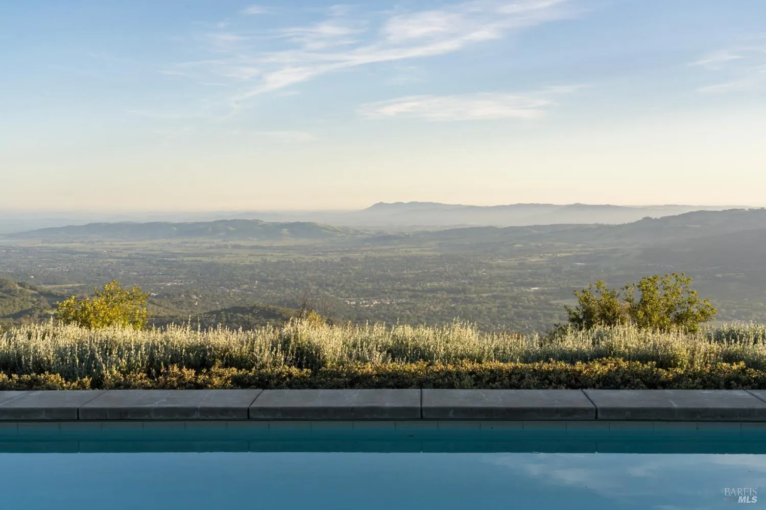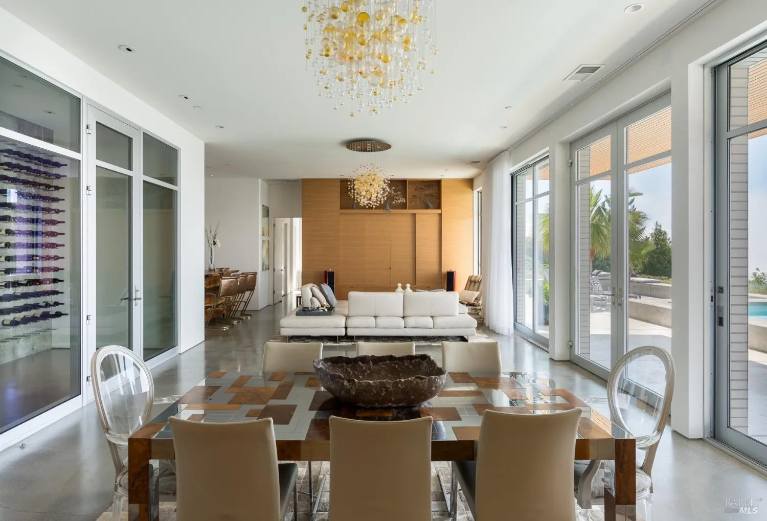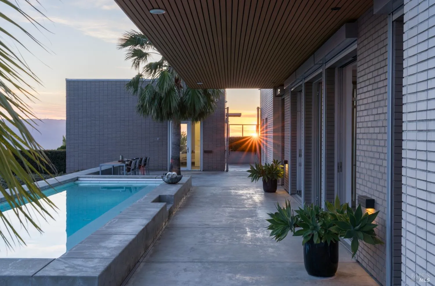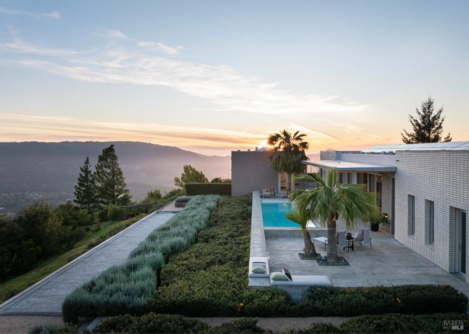 Designed by Portico West, and influenced by Philip Johnson’s Glass House, 2947 Cavedale Road is a remarkable property. Built into the hillside, with views of the San Francisco skyline and the iconic Valley of the Moon, you’re surrounded by a breathtaking landscape. The security gate to enter the property is made up of corrugated steel panels, and is the first introduction to its modern and industrial aesthetic. The interior of the home features an abundance of creative design elements, including custom teak cabinetry, handblown glass chandeliers, and a wine room with a backlit onyx wall. There are two spacious suites, each with separate entries for added privacy. A private guest house is located near the entry doors to the patio. Separating the patio from the inside of the home are custom ten foot doors, which slide into a hidden wall to allow for a complete open. The outdoor space boasts a built-in pool with bench seating around the perimeter, a bocce court, and mature landscaping.