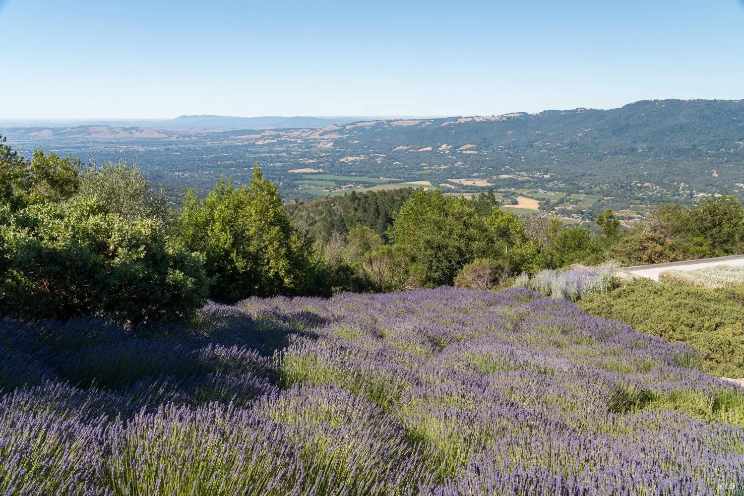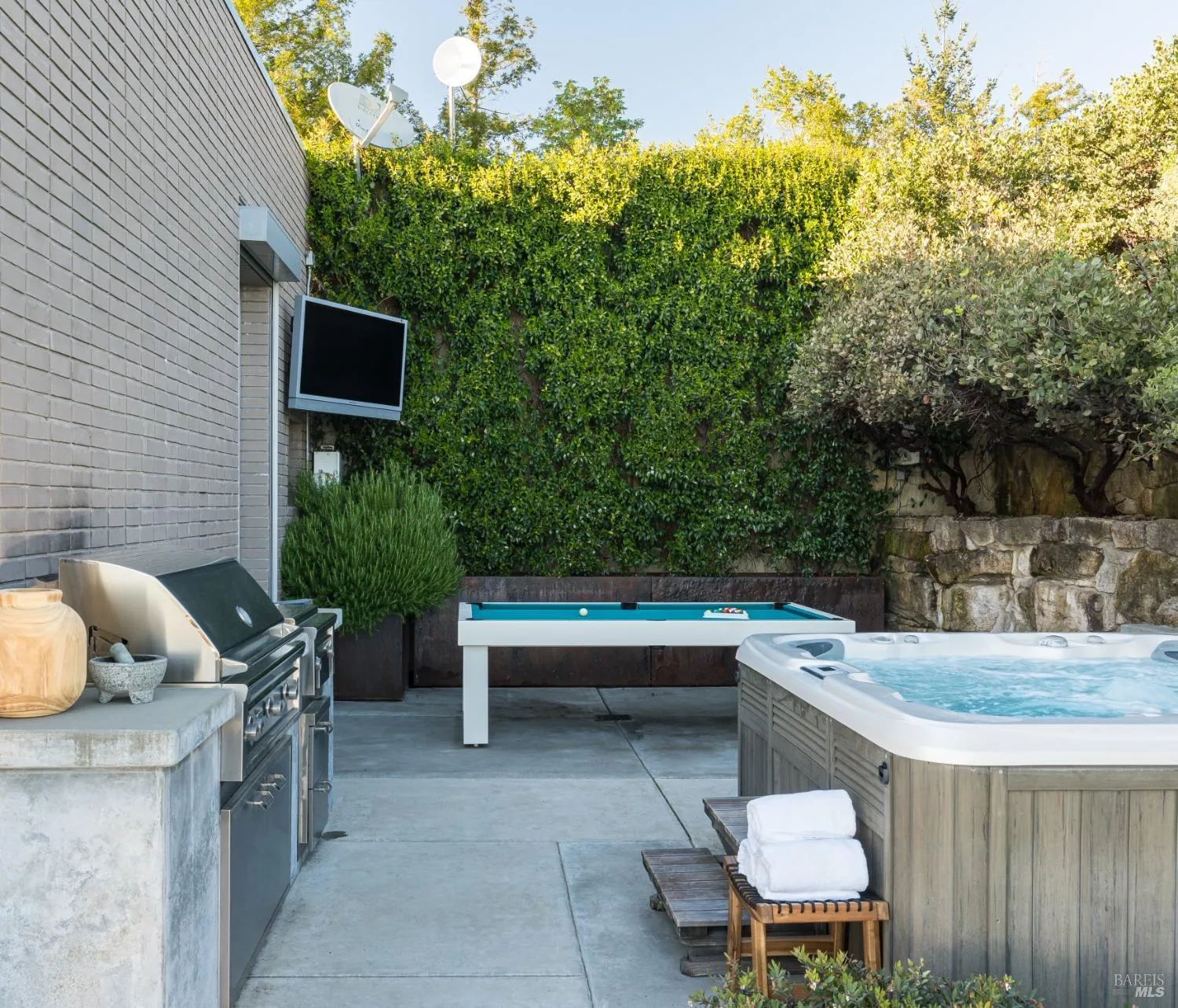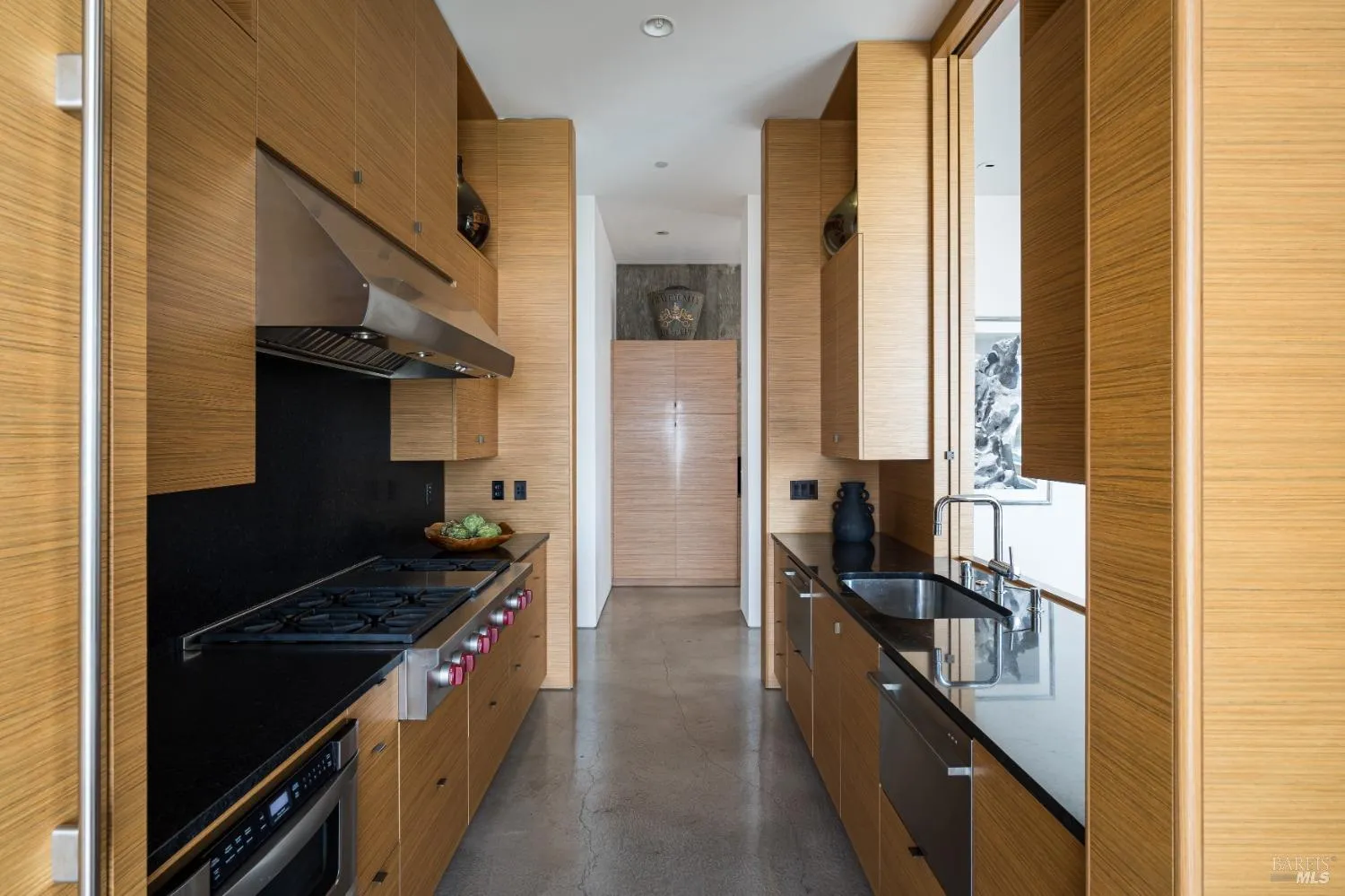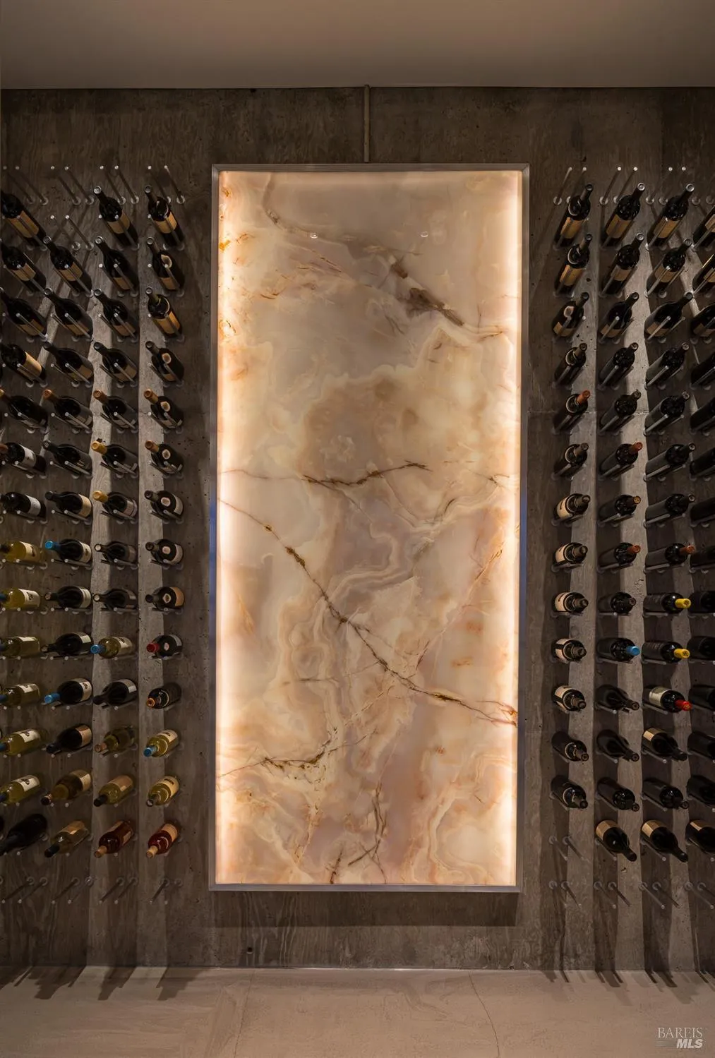 Designed by Portico West, and influenced by Philip Johnson’s Glass House, 2947 Cavedale Road is a remarkable property. Built into the hillside, with views of the San Francisco skyline and the iconic Valley of the Moon, you’re surrounded by a breathtaking landscape. The security gate to enter the property is made up of corrugated steel panels, and is the first introduction to its modern and industrial aesthetic. The interior of the home features an abundance of creative design elements, including custom teak cabinetry, handblown glass chandeliers, and a wine room with a backlit onyx wall. There are two spacious suites, each with separate entries for added privacy. A private guest house is located near the entry doors to the patio. Separating the patio from the inside of the home are custom ten foot doors, which slide into a hidden wall to allow for a complete open. The outdoor space boasts a built-in pool with bench seating around the perimeter, a bocce court, and mature landscaping.