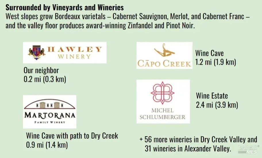 This 40 acres is ideally located 7.9 miles from Healdsburg, overlooking the Dry Creek Valley, in a highly desirable, affluent neighborhood just off of West Dry Creek Rd. The abundant flora and fauna of the land has been catalogued by the current owner and can be provided upon request. The property boasts a potential building site with views stretching across 30 miles of vineyards, hills, and forests all the way to Mount St. Helena in the distance. There is full-bars 5G cellular signal available and wi-fi router which provides even faster speeds – see photos. Water is in good supply with a 30 GPM well and 3 seasonal springs. Currently set up for glamping, one can immediately enjoy the land with hot showers, an outdoor kitchen, 10′ x 20′ fully-enclosed carport tent, treehouse tipi, and power from solar generators. Perc testing completed in 2009 for a 3 bedroom septic system. If you are looking for a slice of a peaceful natural habitat, this is the one. This healthy mixed forest includes Old growth Douglas firs and redwood fairy rings. Enjoy easy access to all things wine country, Lake Sonoma, and the Bay area.